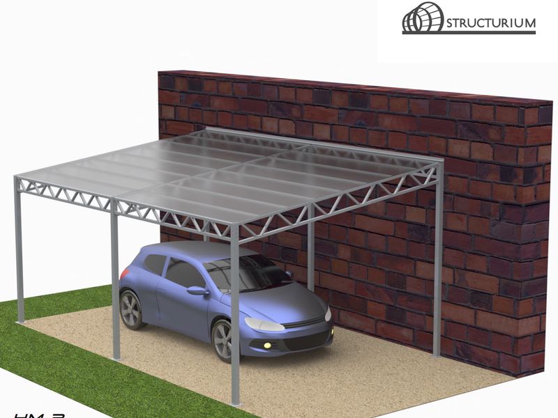 При производстве Навеса для машин односкатного используется профильная труба 80*80*3мм, 40*40*2мм и 40*25*2мм. Покрытие крыши – прозрачный сотовый поликарбонат 10мм. Покраска полимерная порошковая с предварительным нанесением цинкосодержащего грунта, цвет серый.